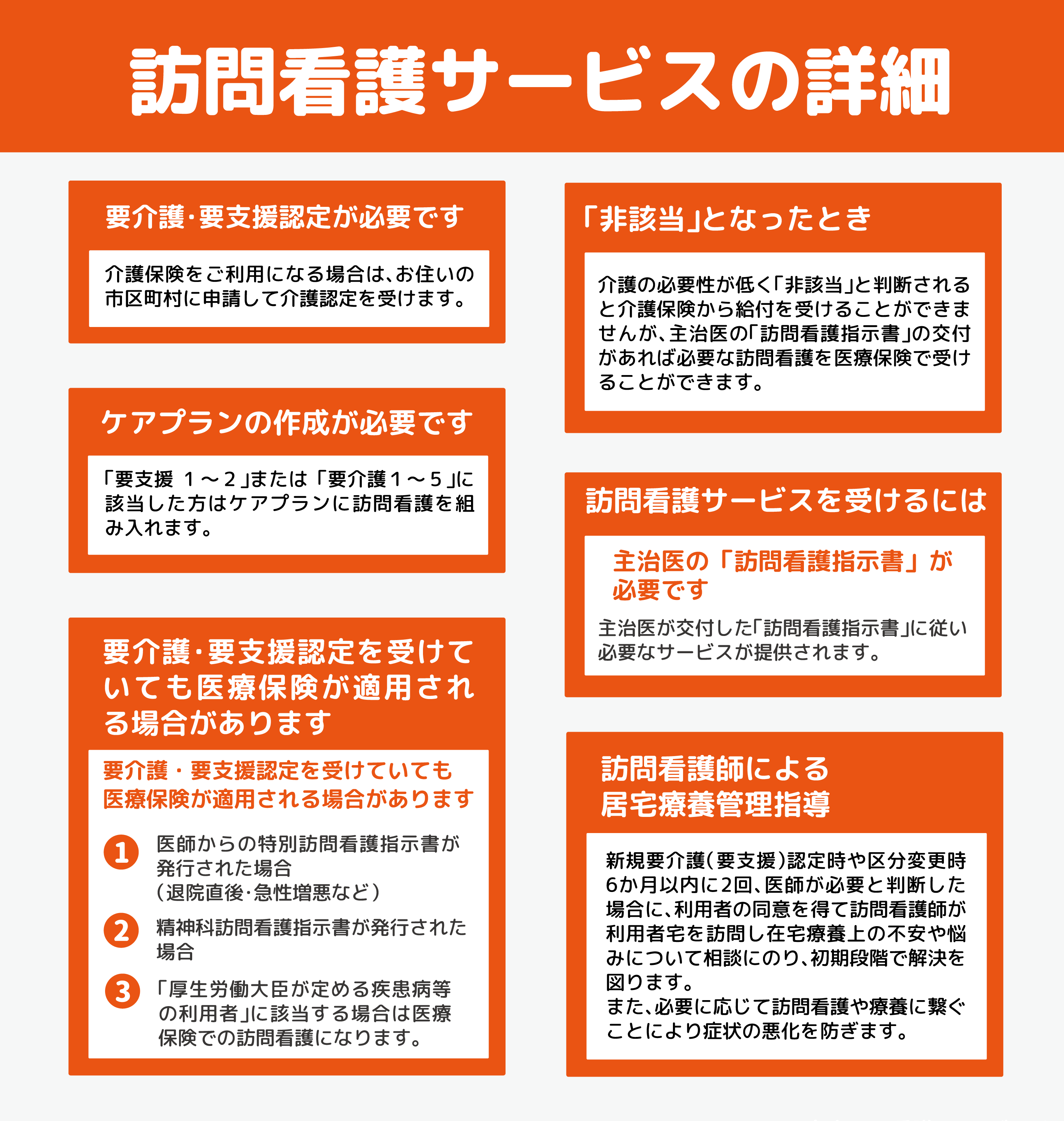 訪問看護は医療保険、介護保険のどちらでサービスを受ける場合もかかりつけ医の指示書が必要となります。(自費の訪問看護サービスには必要ありません。)